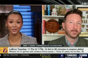 體育資訊11月22日訊 今天的《NBA Today》節(jié)目,主持人Malika Andrews連線了自己的老公、湖人隨隊記者Dave McMenamin,聊到了詹姆斯復出后的安排。