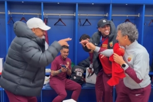 據(jù)記者劉聞超報道,賽后,海港外援古斯塔沃、茹薩與外籍教練一起在更衣室跳舞,慶祝奪冠。