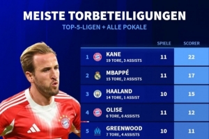 體育資訊10月20日訊 《轉(zhuǎn)會市場》統(tǒng)計了本賽季五大聯(lián)賽球員在俱樂部各項賽事的直接參與進(jìn)球總數(shù)情況,凱恩、姆巴佩、哈蘭德分列前三。