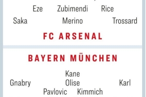 體育資訊11月24日訊 拜仁和阿森納在本輪聯(lián)賽各自取得大勝,兩隊也將在周中迎來歐冠榜首之爭,拜仁作客挑戰(zhàn)阿森納?!短咔蛘摺芬差A測了雙方首發(fā):