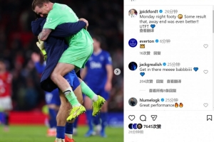 皮克福德社媒曬出慶祝的照片,配文:“周一足球之夜,這樣的結(jié)果太棒了,客場看臺(tái)的氛圍更是無敵,加油埃弗頓!”