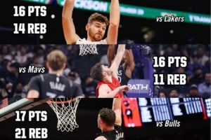 克林根出戰(zhàn)27分鐘9投5中 ,三分4中2,罰球3中2砍下14分12籃板4助攻1搶斷1蓋帽,正負值+14。