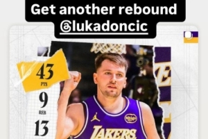 賽后湖人球員拉拉維亞曬出東契奇的數(shù)據(jù)海報(bào),他調(diào)侃道:“你多搶個(gè)籃板啊。”
