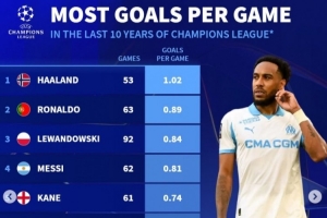 德轉(zhuǎn)列近10年歐冠場均進球榜:至少出場25次