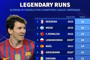 體育資訊11月27日訊 《轉(zhuǎn)會(huì)市場》統(tǒng)計(jì)了歐冠歷史賽季連續(xù)進(jìn)球情況,梅西和本澤馬并列居首。