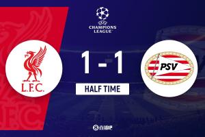 上半場(chǎng)傷停補(bǔ)時(shí)1分鐘,半場(chǎng)結(jié)束,利物浦暫1-1埃因霍溫。