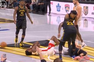 阿門突破撞倒庫里,二人雙雙痛苦倒地。裁判吹罰阿門進攻犯規(guī)。