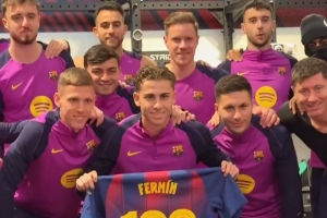 體育資訊11月27日訊 巴薩官推曬視頻,費(fèi)爾明獲得了俱樂部百場里程碑球衣,并在隊(duì)友的簇?fù)硐抡故玖饲蛞隆?/p>