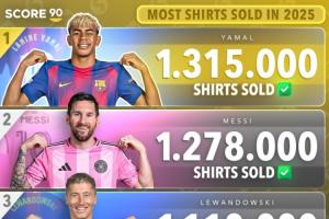 體育資訊11月28日訊 Score 90統(tǒng)計(jì)了2025年世界足壇的球員球衣銷量榜,亞馬爾以131.5萬件排名第一,梅西第二,C羅位列第七。