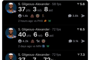 賽后美媒Real Sports曬出了亞歷山大近三戰(zhàn)數(shù)據(jù),寫道:“SGA應(yīng)進入歷史級別得手的討論。”