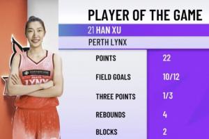 韓旭的WNBL首秀,登場(chǎng)29分鐘,12投10中(三分3中1),罰球2中1,拿到并列全場(chǎng)最高的22分,外加4板1助2帽1斷。