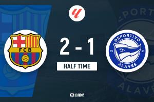 上半場補(bǔ)時(shí)4分鐘,巴薩2-1阿拉維斯。