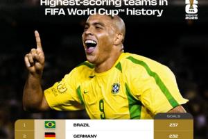 榜單上,巴西237球居首,德國(guó)232球緊隨其后,巴德斷檔前二,阿根廷152球第3,法國(guó)136球第4,意大利128球第5,西班牙、英格蘭、荷蘭、烏拉圭、匈牙利前10。