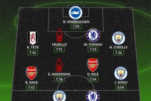 后衛(wèi):肯尼·泰特(富勒姆,7.42分)、穆里略(諾丁漢森林,7.91分)、韋斯利·福法納(切爾西,7.53分)、奧賴(lài)?yán)牵?.36分)