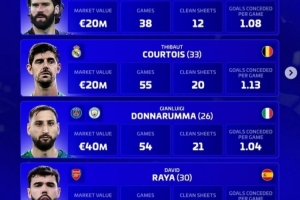 體育資訊12月2日訊 《轉會市場》評選2025年最佳門將,并列出了4人候選同時對比了他們的數(shù)據(jù):