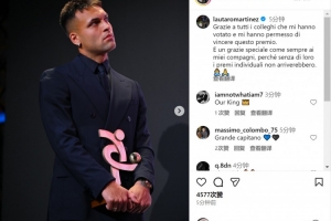 勞塔羅社媒曬出領(lǐng)獎(jiǎng)的照片,并寫道:“感謝所有投票支持我的球員,是你們讓我獲得了這個(gè)獎(jiǎng)項(xiàng)?!?/p>
