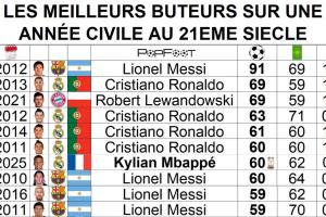 12月份皇馬還剩下5場比賽可踢,姆巴佩有機(jī)會沖擊C羅和萊萬的年度69球,梅西在2012年的91球依舊難以企及。