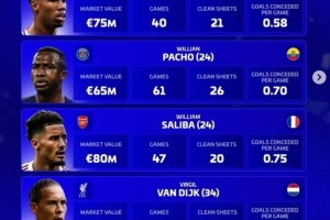 薩利巴(阿森納,24歲,法國(guó)):身價(jià)8000萬(wàn)歐,47場(chǎng),20零封,場(chǎng)均丟0.75球