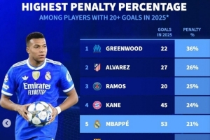 體育資訊12月4日訊 《轉(zhuǎn)會市場》統(tǒng)計(jì)了2025年五大聯(lián)賽各項(xiàng)賽事進(jìn)球超過20球的球員的點(diǎn)球占比情況,格林伍德獨(dú)自領(lǐng)跑。