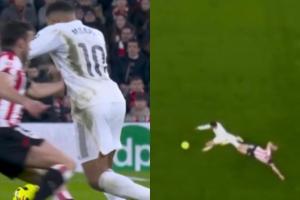 西甲第19輪,皇馬3-0客勝畢爾巴鄂競技,姆巴佩2射1傳。其中第一球,姆巴佩接到阿諾德的長傳,卸球轉(zhuǎn)身擺脫左后衛(wèi)萊奎、帶球推進(jìn)、弧頂變向過掉中衛(wèi)拉波爾特、射門得分,這個過程一氣呵成,萊奎防守姆巴佩時上手拉、下腳鏟都沒攔住!