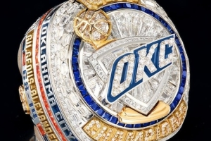 采用14K白金與黃金打造,鑲嵌藍(lán)橙雙色藍(lán)寶石。每枚戒指均以鉆石鑲嵌球員號碼。