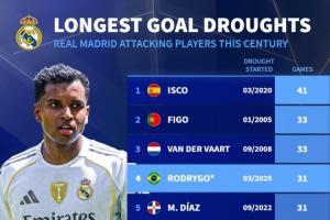 據(jù)德轉(zhuǎn)統(tǒng)計,羅德里戈31場球荒場數(shù)在本世紀(jì)皇馬進(jìn)攻球員上可以排到第4位,僅次于伊斯科、菲戈和范德法特的球荒場數(shù)。