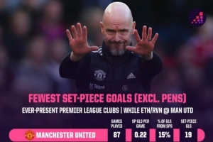 滕哈赫共率曼聯(lián)踢了87場英超比賽,通過定位球打進19球,平均每場0.22球,定位球進球占球隊總進球數僅為15%。本賽季,曼聯(lián)13輪英超比賽已經通過定位球打進10球,和踢了14輪的阿森納持平。曼聯(lián)本賽季場均可通過定位球打進0.77球,定位球進球數占球隊總進球數的47.6%。