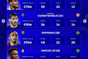 拉菲尼亞(巴薩,28歲,巴西):身價(jià)9000萬歐,48場(chǎng),22球,20助攻