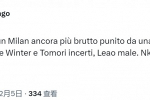 米蘭跟隊(duì)記者隆戈在社交媒體上寫道:“一場糟糕的比賽,米蘭表現(xiàn)更是糟糕,被更具求勝信念的拉齊奧懲罰。德溫特和托莫里表現(xiàn)不穩(wěn),萊奧發(fā)揮不佳,至于恩昆庫——看過比賽的人都會問,他到底在哪里?”