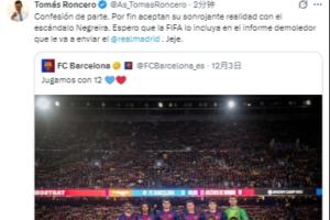 而阿斯報副主編,也是知名皇馬球迷的龍賽羅在社媒轉發(fā)了巴薩官方的這則動態(tài),并表示:“當事人自己招供了,終于承認了內格雷拉丑聞那令人臉紅的事實。希望皇馬把這事寫進即將發(fā)給FIFA的那份“毀滅性報告”里面。呵呵。”
