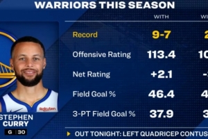 轉(zhuǎn)播方給出一組數(shù)據(jù),本賽季庫里在場時(shí)勇士9勝7負(fù),進(jìn)攻效率113.4,凈效率+2.1,投籃命中率46.4%,三分命中率37.9%;