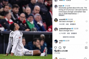 阿諾德社媒寫道:“對這次受傷真的感到非常沮喪。這個時機太難熬了,但我會努力訓練,變得更強、更好!2026年再見,皇馬球迷們 ??”