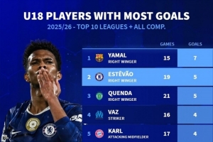 體育資訊12月6日訊 德國轉會市場統(tǒng)計了本賽季前十聯(lián)賽U18球員的進球數(shù)量,并列出榜單,亞馬爾7球居首,埃斯特旺5球并列次席。