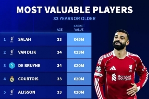 體育資訊12月7日訊 德國轉(zhuǎn)會市場統(tǒng)計了年齡33+球員的身價,并列出榜單,薩拉赫4500萬歐居首,梅西1800萬歐第七。