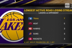 湖人上一次在費(fèi)城贏(yíng)球還要追溯到2017年12月7日。