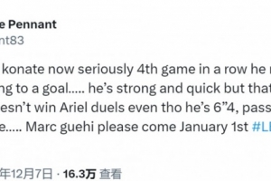 彭南特寫道:“我真是受夠科納特了,這已經(jīng)是他連續(xù)第四場比賽犯錯(cuò)導(dǎo)致失球了……他雖然身體強(qiáng)壯速度快,但僅此而已,技術(shù)簡直糟糕透頂,明明身高1米93卻連空中對抗都贏不了,傳球水平跟業(yè)余聯(lián)賽球員沒兩樣,格伊請務(wù)必在1月1日加盟利物浦。”