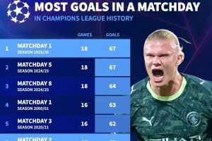 歐冠比賽日進(jìn)球榜:本賽季首輪、上賽季第五輪67球并列居首