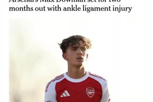 體育資訊12月10日訊 據(jù)TA記者奧恩斯坦消息,15歲阿森納小將道曼腳踝韌帶受傷,將傷缺2個月。