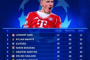 歐冠改制后連續(xù)3場破門最年輕榜單:17歲卡爾居首,姆巴佩次席