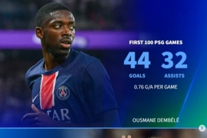 體育資訊10月22日訊 在本輪歐冠巴黎7-2擊敗勒沃庫森的比賽中,登貝萊迎來巴黎生涯100場里程碑,德轉(zhuǎn)也對比了登貝萊與內(nèi)馬爾、伊布、姆巴佩等人在巴黎前100場參與進球數(shù)據(jù):