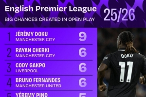 本賽季英超運(yùn)動戰(zhàn)創(chuàng)造重大機(jī)會排名: