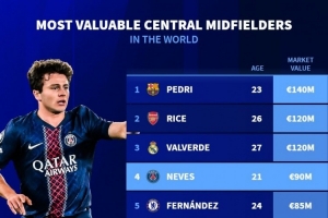 體育資訊12月13日訊 德國(guó)轉(zhuǎn)會(huì)市場(chǎng)統(tǒng)計(jì)了中場(chǎng)中路球員(CM)的德轉(zhuǎn)身價(jià),并列出榜單,佩德里1.4億歐居首。