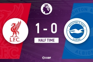 傷停補時3分鐘。上半場比賽結(jié)束,利物浦1-0布萊頓。