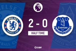 上半場(chǎng)傷停補(bǔ)時(shí)3分鐘,半場(chǎng)結(jié)束,切爾西暫2-0埃弗頓。