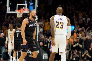 GIF-詹姆斯抓著裁判抱怨狄龍觸球