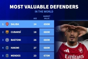 體育資訊12月15日訊 德國(guó)轉(zhuǎn)會(huì)市場(chǎng)列出了后衛(wèi)身價(jià)排名,薩利巴9000萬(wàn)歐居首。