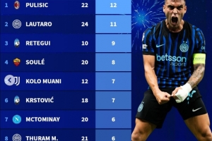 2025年意甲球員客場進(jìn)球排行:普利西奇12球第一,勞塔羅11球第二