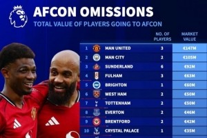 體育資訊12月17日訊 非洲杯即將戰(zhàn)火重燃,《轉會市場》也統(tǒng)計了因為要參加非洲杯而離隊的英超各隊身價損失榜,曼聯(lián)居首。