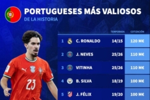 體育資訊12月18日訊 巴黎圣日耳曼首奪洲際杯,加冕六冠王。巴黎陣中多名表現出色的葡萄牙球員是球隊奪冠的基石,他們的身價也隨之水漲船高。德轉統(tǒng)計了葡萄牙歷史上身價最高的球員的榜單,毫無意外地,C羅當仁不讓位居榜首。
