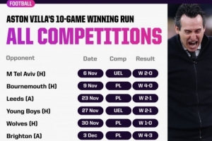 在球隊(duì)作為頂級(jí)聯(lián)賽俱樂部的111年時(shí)間里,維拉首次取得正式比賽10連勝。而且,這也是他們自1990年以來,首次在頂級(jí)聯(lián)賽中取得7連勝。